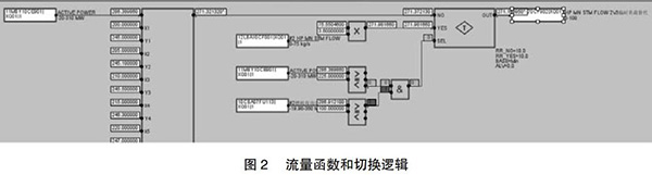 但是由于近期趨勢(shì)可能收集不到部分負(fù)荷段的相關(guān)數(shù)據(jù),在超出現(xiàn)有數(shù)據(jù)負(fù)荷的部分應(yīng)采取必要的補(bǔ)救措施,可以參考相同負(fù)荷運(yùn)行的另一臺(tái)余熱鍋爐的主蒸汽流量,以此來(lái)彌補(bǔ)現(xiàn)有數(shù)據(jù)的不足。為了保證數(shù)據(jù)切換的可靠性,切換條件要嚴(yán)謹(jǐn),現(xiàn)有函數(shù)的負(fù)荷下線(xiàn)上增加25MW與另外一臺(tái)的燃機(jī)負(fù)荷大于100MW。如此設(shè)置的好處是當(dāng)另一臺(tái)運(yùn)行機(jī)組突然故障或跳機(jī)時(shí)保證數(shù)據(jù)能及時(shí)切換到函數(shù)輸出,保證機(jī)組的安全運(yùn)行。具體操作見(jiàn)圖2。