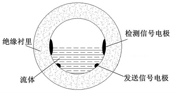 ③利用阻抗或信號(hào)衰減研制的非滿管工業(yè)污水流量計(jì)。這種結(jié)構(gòu)的非滿管工業(yè)污水流量計(jì)是當(dāng)前國內(nèi)研究的方向之一。其結(jié)構(gòu)是流量管底部貼一對(duì)信號(hào)發(fā)射電極,在流量管中間貼信號(hào)接收電極。由于信號(hào)在流體中傳播會(huì)產(chǎn)生衰減,且傳播時(shí)間越長,衰減越多,因此通過信號(hào)接收電極接收到的信號(hào)衰減量即可得知液面高度;同時(shí)該電極還能測(cè)量流體切割磁感線產(chǎn)生的電動(dòng)勢(shì),以此達(dá)到測(cè)量非滿管流量的目的。阻抗式或信號(hào)衰減非滿管工業(yè)污水流量計(jì)結(jié)構(gòu)簡(jiǎn)圖如圖5所示。