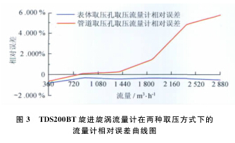 例,系統(tǒng)運行時間為60s,標準裝置的滯止平均溫度為29.7℃,空間平均濕度為42%,流量計的平均溫度為29.3℃,在表體取壓孔取壓和管道取壓孔取壓的流量計檢定試驗數(shù)據(jù)分別如表3、4所示。兩種取壓方式下的流量計相對誤差曲線如圖3所示。