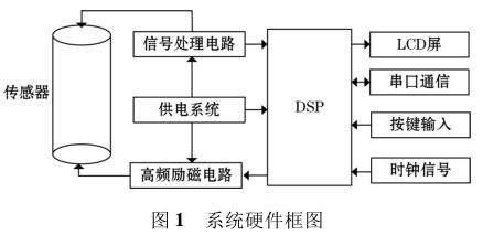 高頻勵(lì)磁防腐型電磁流量計(jì)由傳感器、高頻勵(lì)磁電路、信號(hào)處理電路等組成,其中高頻勵(lì)磁電路決定著傳感器磁場(chǎng)的強(qiáng)弱,勵(lì)磁電路的穩(wěn)定性以及精確性決定著系統(tǒng)檢測(cè)的準(zhǔn)確性以及穩(wěn)定性。DSP 系統(tǒng)控制勵(lì)磁電路激勵(lì)傳感器線圈,當(dāng)線圈中有導(dǎo)電液體流過(guò)時(shí),其切割磁感線并在傳感器兩端的線圈上產(chǎn)生感應(yīng)電動(dòng)勢(shì),利用信號(hào)檢測(cè)電路監(jiān)測(cè)感應(yīng)電動(dòng)勢(shì)的大小,*后根據(jù)相應(yīng)關(guān)系計(jì)算出液體的流量,系統(tǒng)硬件框圖如圖 1 所示。