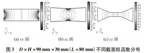 4) 圖 3( c) 、圖 4( c) 的 yz 面權函數(shù)分布表明,D = 90 mm時的權函數(shù)等勢線間距略大于 D = 60 mm 時的權函數(shù)等勢線間距,權函數(shù)變化梯度較小,且中心區(qū)域的權函數(shù)等勢線逐漸變?yōu)橹本€,因此 D = 90 mm 的權函數(shù)分布更均勻一些,但是兩者區(qū)別很小,即寬度改變對 yz 面權函數(shù)分布影響很小。圖 4( c) 、圖 5( c) 的 yz 面權函數(shù)分布表明,H = 30 mm時的權函數(shù)等勢線間距較大,且中心區(qū)域的權函數(shù)等勢線逐漸變?yōu)橹本€,因此 H = 30 mm 的權函數(shù)分布更加均勻;