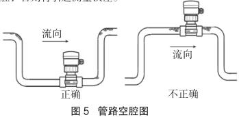 測量流向取決于高壓電磁流量計的安裝方位,將高壓電磁流量計在接頭上旋轉 180 度即可反向。正流向時,高壓電磁流量計的突耳應在上游方向。流量顯示總是正的,而累加器可以根據(jù)流向增加或者減少。安裝中確認管路設計不允許在介質中產(chǎn)生氣泡或空腔,否則將引起測量誤差(見圖 5)。
