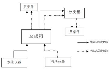 安全殼遠(yuǎn)傳渦街流量計以總成箱和分支箱為核心。試驗初期,將總成箱置于儀器放置區(qū),分支箱置于貫穿件集中區(qū)域附近,檢漏儀至總成箱再至分支箱之間的管線固定連接,如圖2所示。水法試驗管路與氣法試驗管路互相獨立,總成箱和分支箱的每一路連接采用編號標(biāo)記進(jìn)行區(qū)分,并設(shè)置控制閥控制開關(guān)和流向。