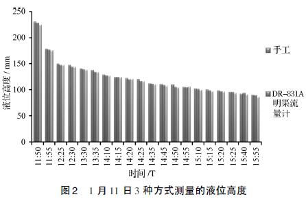 見圖3,以手工實測液位高度為基準(zhǔn),2種流量計的誤差均在±5%的范圍內(nèi)。除在1月9日14:40和14:45兩個時間點測量值表現(xiàn)出DR-831A測量誤差高于TKL-Ⅰ外,其他時段都明顯表現(xiàn)出DR-831A測量誤差小于TKL-Ⅰ。